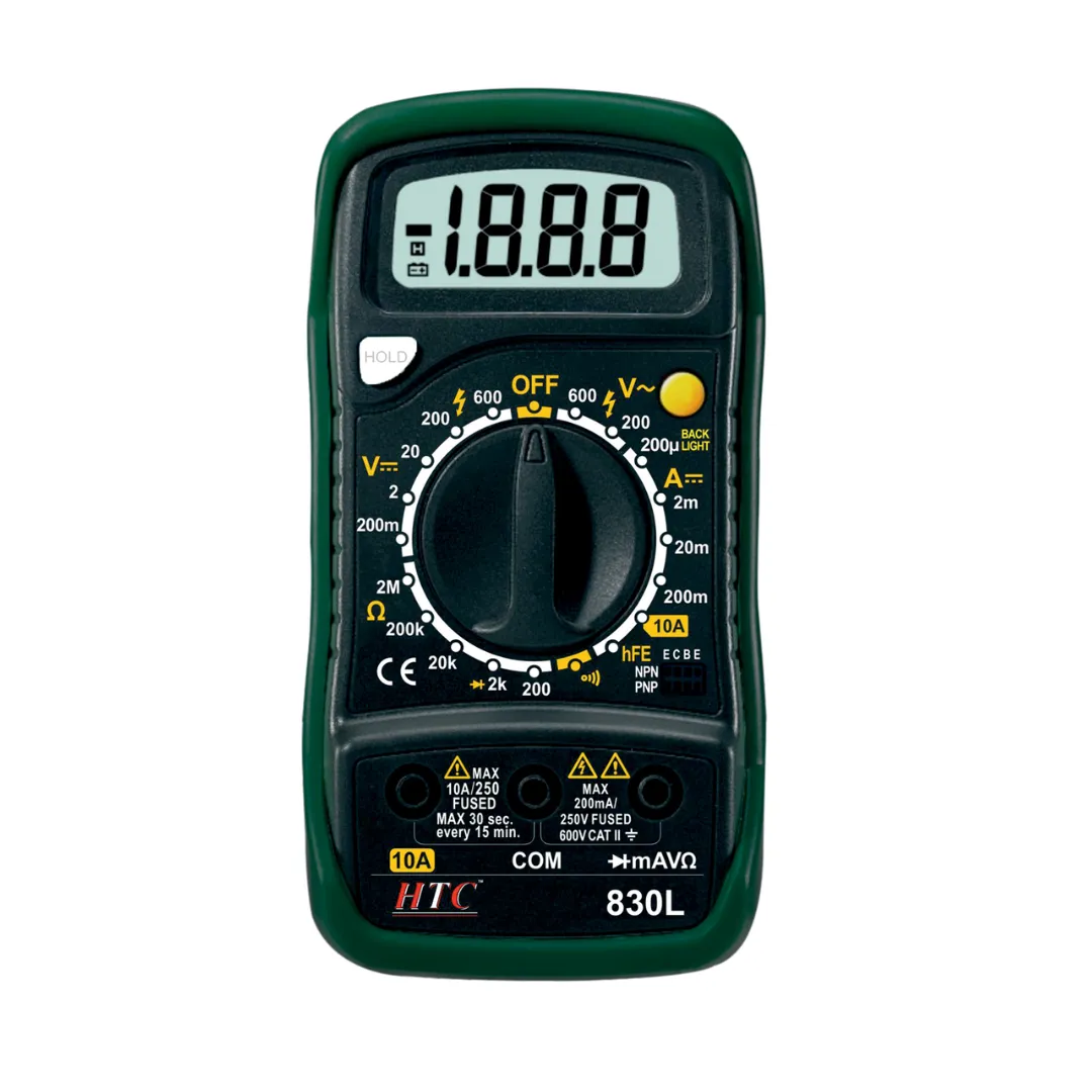 The DM-830L is engineered to measure multiple parameters, including AC and DC voltage, DC current, resistance, diode testing, transistor hFE testing, and continuity checks, making it an all-in-one solution for electrical diagnostics. It can measure DC voltage up to 600V across five ranges (200mV to 600V) with high accuracy (±0.5% to ±0.8%), ensuring precise readings in sensitive low-voltage circuits as well as high-voltage applications. For AC voltage, it supports ranges of 200V and 600V with accuracy of ±1.2%, making it suitable for household wiring checks, appliance testing, and industrial voltage monitoring.