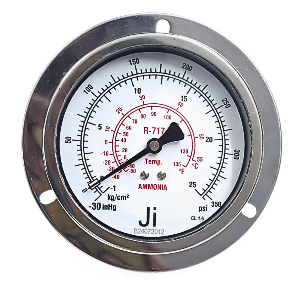 “JI” Japsin Instrumentation Economical Ammonia Gauge, Dial Size 4″ (100 mm), Stainless Steel 304 Case Crimping Type, Range -30 inHg to 360 PSI with a dual scale of -1 to 25 Kg/cm2, Panel Mounting Back Entry, Connection 3/8″ BSP (M), Accuracy 1.6% FSD